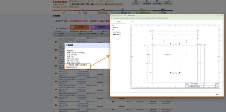 生産器材ECサイト「フタバオーダーサイト」のプレート見積よりご利用いただけるサービスで、任意の二次加工をブラウザ上で簡易的にご指定、調達できるサービスです。加工入力の後、見積り金額が即時に算出されます。